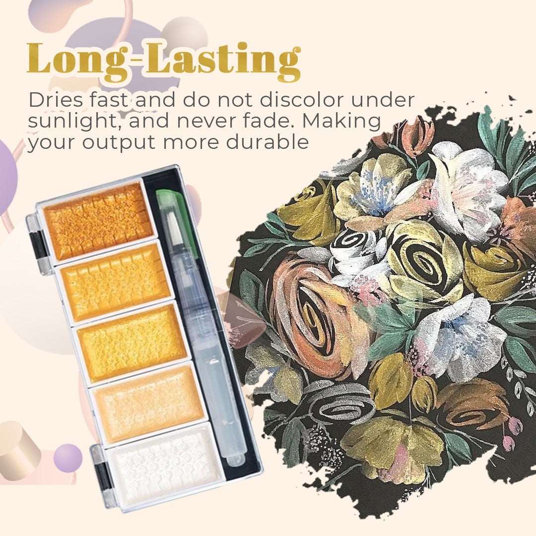 Be swoon over with this Metallic Glitter Watercolor Kit Set! Brush up your painting skills and create magnificent artworks with a unique and shimmering effect, featuring high levels of artistry, colors and quality. Infused with intense pigmented shades in a liquid metal finish, making extraordinary and realistic pieces of art.